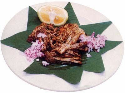 Se baña entonces con la manteca derretida, se envuelve muy bien en las hojas de plátano, se tapa con papel de aluminio y se hornea a horno precalentado a 350ºF durante 1½ horas, o hasta que esté tan suave que casi se desbarate.