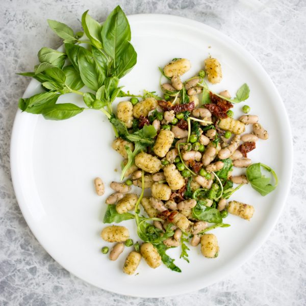 Once the gnocchi is cooked, heat a little olive oil in a large skillet. Add the gnocchi and fry for a few minutes until it starts to turn golden brown on the edges. At this point, reduce the heat, and all the other ingredients and a few spoons of the pesto. Heat until everything is warm through. Add a few more arugula leaves if desired.