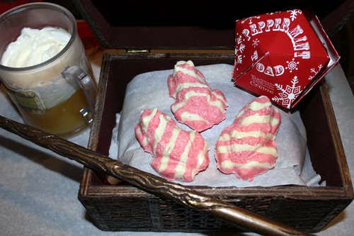Melt the remaining cup of white chocolate and add in food colouring and marshmallow creme. Once combined, add honey and shortening. Finally, add peppermint flavour to taste. Mix thoroughly.