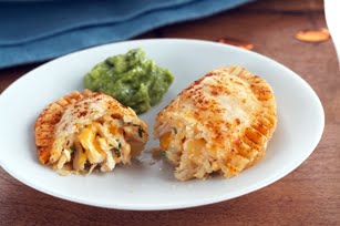 UNROLL pie crusts on lightly floured surface. Use rolling pin to roll each to 12-inch circle. Cut each crust into 8 (4-inch) circles with biscuit cutter, re-rolling dough as needed. Place on parchment-covered baking sheets. Spoon 2 Tbsp. chicken mixture onto center of each circle; brush edge with egg. Fold dough circles in half. Press tops lightly to remove excess air; seal edges with fork. Brush tops with remaining egg. Sprinkle with chili powder.