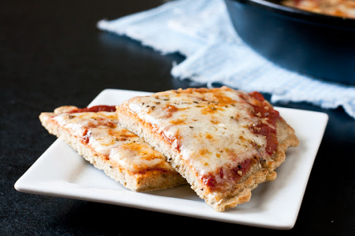 tips/substitutions: Using any flour combination of oat, millet, quinoa, buckwheat, corn, etc. should work. The batter should be pourable, but not runny. You can also sub 1/4c white flour and 1/4c whole wheat flour, but add 1-2T more milk. [Made that version for Chris.] Use any high heat oil to cook with in the pan. If you don’t have an oven-safe pan, transfer the cooked dough to a baking sheet for broiling. You can make multiple crusts and refrigerate or wrap tightly and freeze. However, once the pizzas are made with sauce, they’re best if eaten right away.