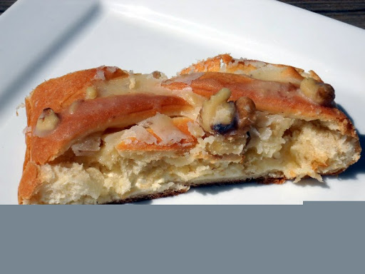 Punch down the dough and divide in half. On a floured surface roll out 1 piece of dough into a rectangle. Using a pizza cutter or knife lightly score the rectangle into thirds. Now make diagonal slices to make strips on the two outer sections (about every half inch) carefully cut away the very top strips and the very bottom strips (to allow room to close the top and bottom). Spread half of the filling into the center of the dough. Start folding the edges-- bring the top and bottom folds over and criss cross the edges starting left to right. *Repeat with the second set of dough