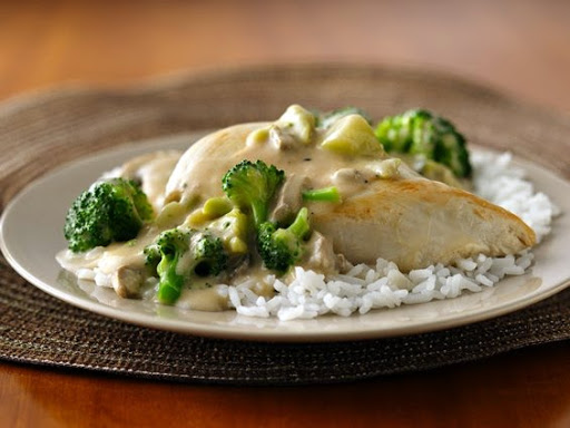 2. Pour soup over chicken. Place broccoli & cheese around chicken. Sprinkle with thyme and pepper. Reduce heat to medium.