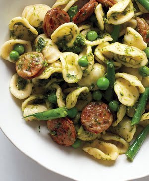3. Add the sausage, pesto, Parmesan, and ½ cup of the reserved cooking water to the pasta and vegetables and toss to combine (add more cooking water if the pasta seems dry).