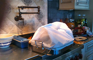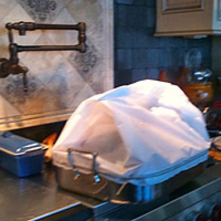 To ensure supermoist meat throughout, Martha Stewart suggests wrapping the bird in parchment paper. Note: The image shown is similar to what a wrapped bird may look like; however, with this method, the last piece of parchment will be folded and stapled from the neck to the base of the turkey.