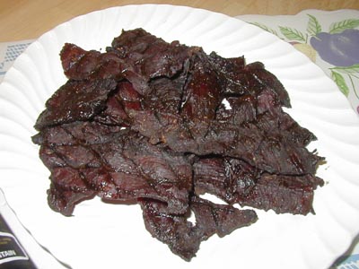 3. Preheat smoker to 180 degrees F. Fill water pan with remaining can of Coca Cola, 1/2 cup water and 2 tablespoons mince garlic. Sprinkle generously with Jane's Krazy salt and place on middle and tip racks in smoker. Do not let strips touch. Smoke for at least 3 1/2 to 4 hours, checking for doneness and dryness after 3 1/2 hours, or until internal temperature reaches 145 degrees F. If not ready, continue smoking for another 30 minutes, until meat is a dark color inside and out.
