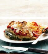 Position a rack in the upper third of the oven and preheat to 400°. Line a baking sheet with parchment. Stuff one-quarter of the spinach mixture into the pocket of each eggplant steak. Transfer to the baking sheet. Spoon the marinara over the stuffed eggplant steaks. Top with the ciabatta-cheese mixture, mounding it with cupped hands. Bake until the cheese is melted and the bread is golden, about 10 minutes.