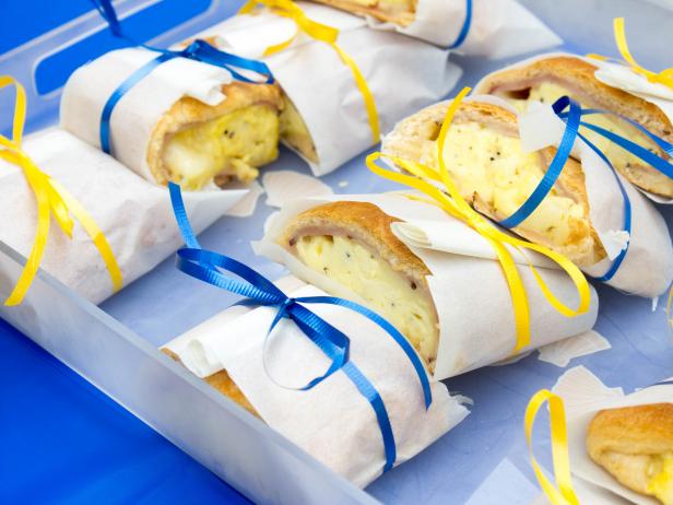2. Place five slices of the ham in a single layer down the center of the rectangle. Repeat with 5 slices of the cheese. Top with half of the scrambled eggs.