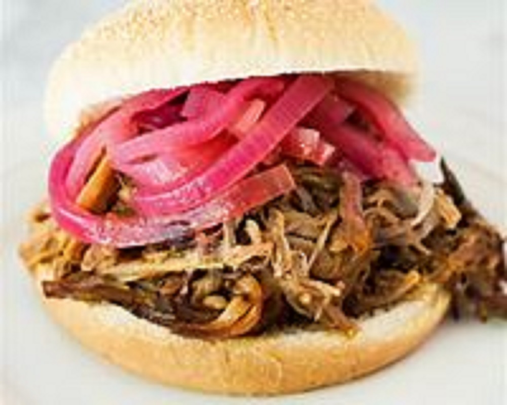Smokey tender shredded pork sandwich with your favorite toppings. Yes please and thank you!