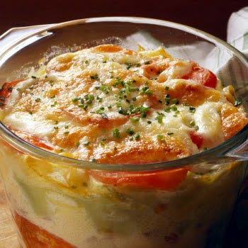 In a large bowl, place the tomatoes then stir in the savory, sugar, salt, pepper, green onions and grated cheddar and stir well. Pour tomato mixture over macaroni and stir to combine. Lay slices of cheese over top of casserole. Beat eggs with milk, then pour over casserole; do not stir.