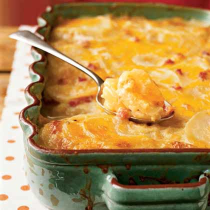 Layer 1/2 of the potatoes into bottom of the prepared casserole dish. Top with the onion slices, and add the remaining potatoes. Season with salt and pepper to taste.