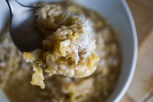 Freshly ground black pepper Put the cabbage and broth into a soup pot, and turn on the heat to medium. When the broth comes to a boil, add the rice. Cook, uncovered, adjusting the heat so that the soup bubbles at a slow but steady boil, stirring from time to time until the rice is done. It must be tender, but firm to the bite, and should take around 20 minutes. If while the rice is cooking, you find the soup becoming too thick dilute it with a ladleful of homemade broth or water. The soup should be on the dense-ish side when finished.