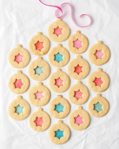 Preheat oven to 350°, with racks in upper and lower thirds. Working with 1 disk at a time, roll out dough between floured parchment paper to 1/8" thickness. Stack dough in parchment on a baking sheet; refrigerate until firm, 30 min. With a 2½" Christmas-ball-shaped cutter, cut out dough (re-roll scraps, if desired). Place cookies, 1" apart, on two parchment-lined baking sheets. With a 1" star cutter, cut out dough in center of each cookie. Bake until cookies are pale but set, 6-8 minutes, rotating sheets halfway through. Remove sheets from oven; fill cutouts with crushed candy. Bake until cookies begin to brown at edges and candy is melted, 3-5 minutes. Let cool completely on sheets on wire racks.