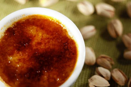 9. Use a small torch to caramelize the tops of each of the custards. Alternatively, place the ramekins on a baking sheet and place under the broiler just until the sugar melts and caramelizes, 1 to 2 minutes.