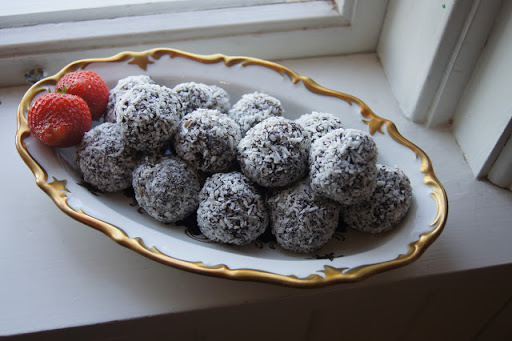 3. In a separate bowl you can add in whatever you wish to use as coating (I usually prefer using shredded coconut). Using the truffle dough, form a small ball with your hands (or to prevent it from being too sticky, use a spoon), place into the bowl with the coating and shake the bowl around in a circle motion it until it the truffle properly coated, so you can easily pick it up and place on a plate. Repeat until all the dough is spent. Store in the fridge until serving. They taste best after being in the fridge for at least 1 hour!