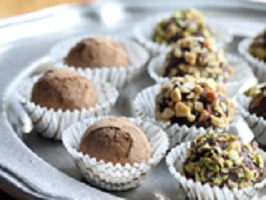 SCOOP chocolate mixture by rounded measuring teaspoon onto prepared baking sheet. Refrigerate for 20 minutes if needed before rolling into balls. Coat with chopped nuts and/or cocoa. Store in airtight container in refrigerator. Let truffles sit at room temperature for 5 to 10 minutes before serving.