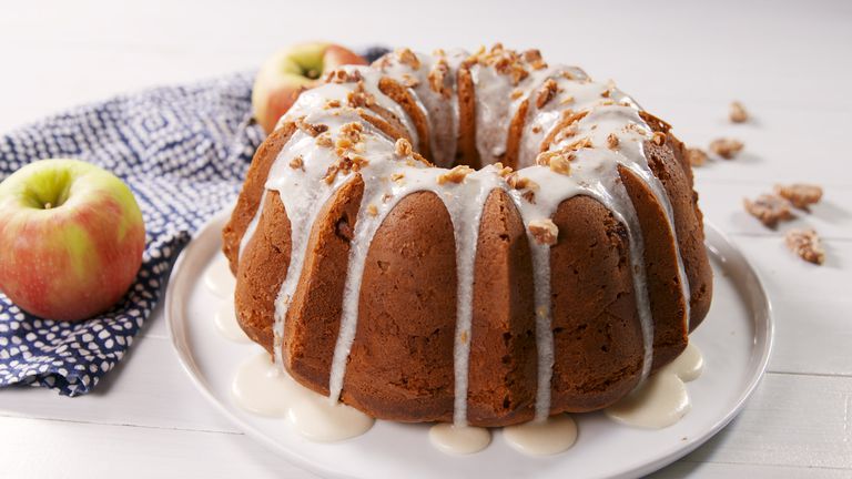 Pour glaze over cooled cake and sprinkle with remaining walnuts before serving.