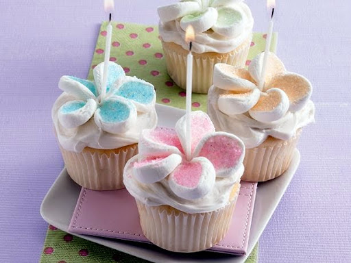 Using kitchen scissors, cut each marshmallow crosswise into 4 slices. Sprinkle slices with colored sugar. Arrange 5 slices on each cupcakes in flower shape. Place candle in center of each flower.