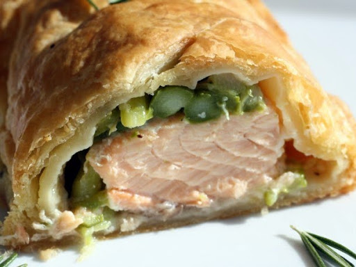 Unfold both sheets of puff pastry, and lay them separately on a counter or cutting board. Place one piece of salmon on one side of each sheet of puff pastry. Top each salmon fillet with half the asparagus mixture. Then, fold the pastry over the salmon, and press the pastry together to form a seal. Trim any pastry border in excess of 1 inch, and then crimp the edge of the pastry. Cut 2 or 3 steam vents in the top of the pastry, and place the two parcels on a parchment-lined rimmed baking sheet. Bake until puffed and golden, about 35 minutes. Slice each parcel in half, and serve immediately.