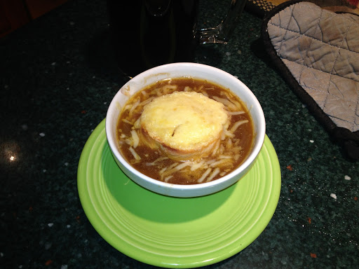 Brown the onion and sugar in butter and oil. Add the garlic and sauté for three minutes. Add the flour and mustard and cook for additional three minutes. Add cognac, ignite, and reduce. Add the stocks and worchestershire sauce and simmer for 20 minutes. Adjust for seasoning. At this stage refrigerate and the next day reheat and add the vermouth. Put 1 slice of toast and cheese on each serving and broil to bubbling and serve.