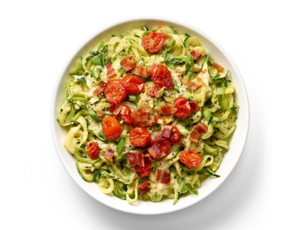 Heat the remaining 1 tablespoon olive oil in a large nonstick skillet over medium-high heat. Add the zucchini noodles and season with salt and black pepper. Cook, stirring, until the zucchini is just softened, 2 to 3 minutes. Using tongs, transfer the zucchini to the cheese sauce, leaving any extra liquid in the skillet. Cook over medium heat, gently tossing until coated; season with salt and black pepper. Top with the roasted tomatoes, bacon and scallion greens.