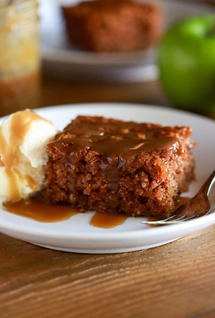 Fresh Apple Cake made with grated apples and spices, topped with homemade caramel