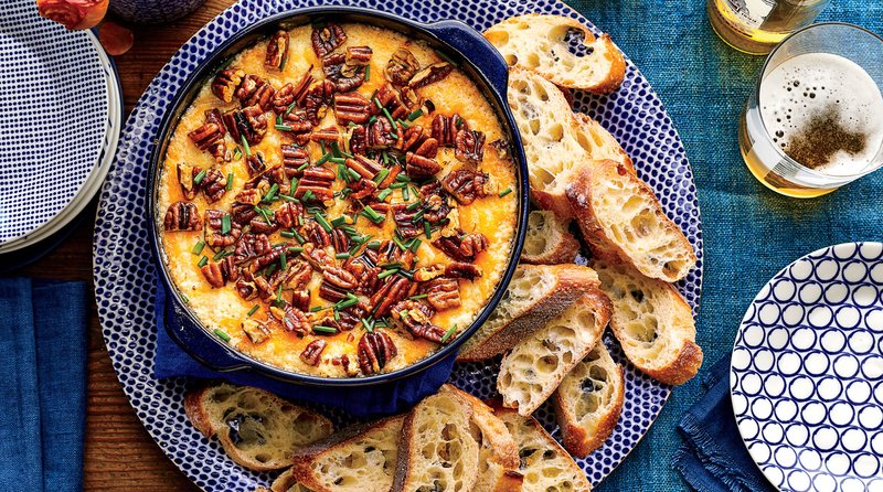Bake in preheated oven until golden and bubbling around the edges, about 15 minutes. Remove from oven; sprinkle with Spicy Pecans. Cool 5 minutes; sprinkle with chives. Serve with toasted baguette slices.