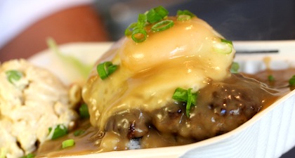 Serve the burger patty on a bed to hot steamed rice, with a fried egg over it and gravy drizzled on top.