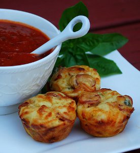 Preheat the oven to 375. Grease a 24-cup mini muffin pan. In a large bowl whisk together the flour and baking powder, whisk in the milk and eggs. Stir in the mozzarella and pepperoni. Let stand for 10 minutes.