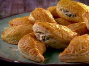 Unfold 1 sheet puff pastry on a lightly floured surface. Using a floured rolling pin, roll out to 1/4-inch thickness. Using a 5-inch diameter cutter, cut out 4 circles. Repeat with the remaining puff pastry sheet. Spoon 1 tablespoon cream cheese mixture in the center of each round. Brush the edge of each circle with egg wash and fold each empanada into a half moon. Crimp the edges with a fork.