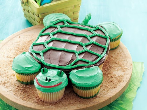 Frost remaining cupcakes with green frosting for shell and chocolate frosting for head and feet. Pipe chocolate frosting on green shell to create turtle design. Add 2 candies for eyes; add pupils with chocolate frosting. Add nostrils with green frosting or miniature chocolate candies. Add red string licorice for mouth (trimming to fit) and green licorice for tail. Store loosely covered.