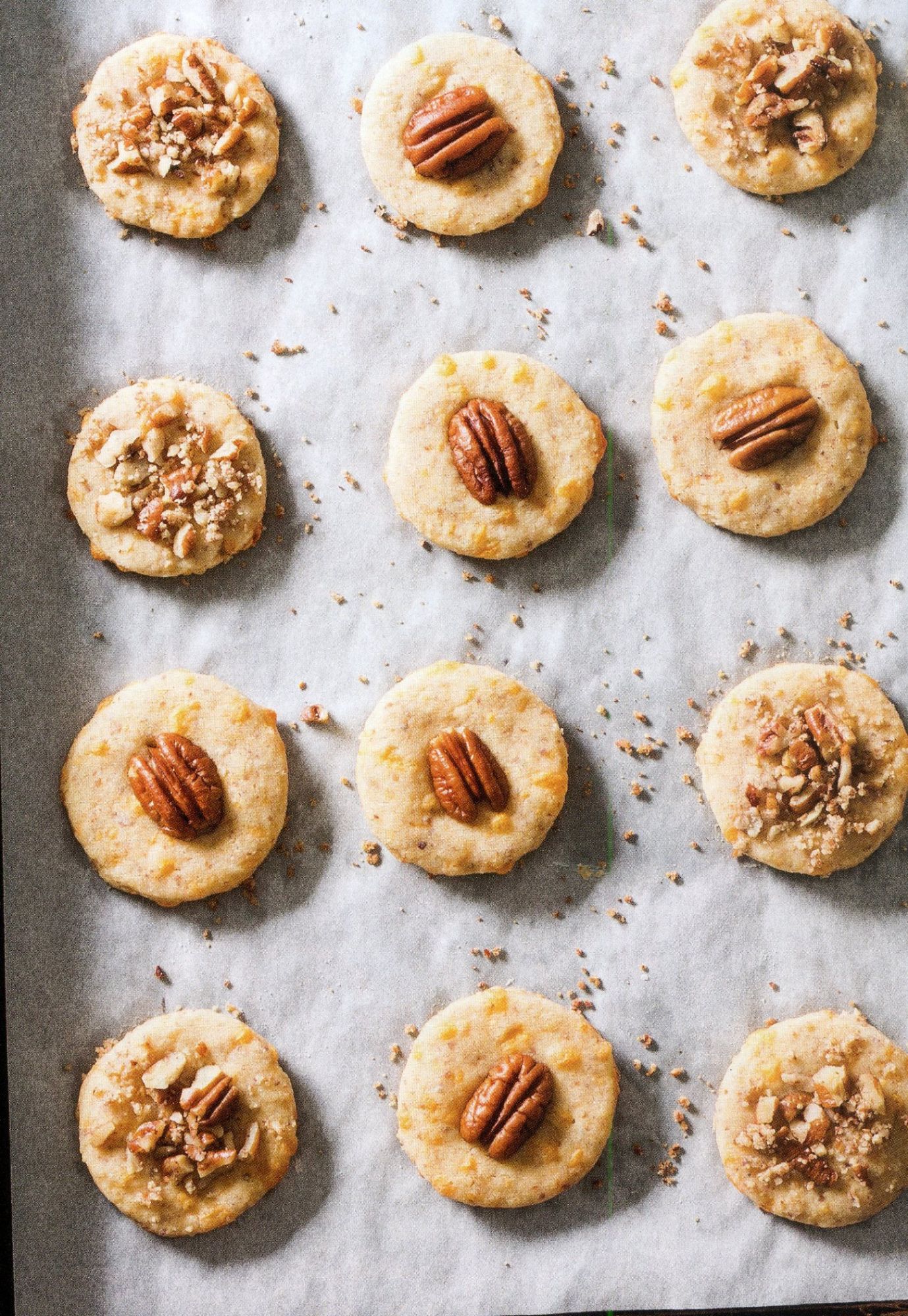 3. On a lightly floured surface, roll dough to !/4-inch thickness. Using a 1 3/4-inch round cutter, cut 40 rounds from dough, rerolling scraps as necessary. Place 1/2 inch apart on prepared pan. Gently place 1 pecan half on each slice, or sprinkle with chopped pecans.