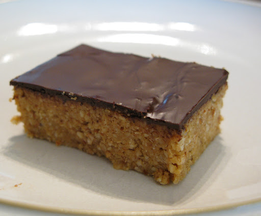 6. Melt chocolate either in microwave on low power on in a double boiler. Drizzle over almond coconut base and spread with a spoon or rubber spatula until evenly coated. Place bars back in refrigerator for approximately 5 minutes, until chocolate is solid but still a little soft (for ease of cutting). Cut into bars and store in a plastic container in the fridge.