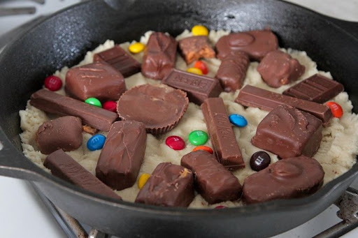 Skillet Baked Candy Bar Stuffed Double Cookie