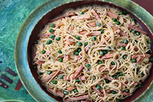 2. Slowly stir in pasta, seasonings, and onion. Separate pasta with a fork, if needed. Return to a boil. Boil uncovered 3 minutes. Add peas; continue boiling 1 to 2 minutes or until pasta is tender, stirring frequently.