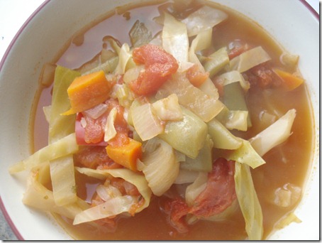 Add your vegetable broth. While this is heating through, add your green beans and chop your cabbage. Add your cabbage — it will look like it is very bulky. It WILL cook down!