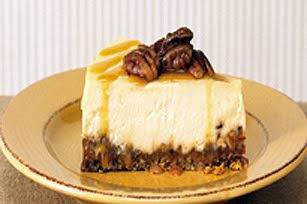 • 1-1/4 cups Honey Maid Graham Crumbs 1/4 cup butter, melted 1 pkg. (269 g) Kraft Caramels, divided 1/4 cup milk, divided 1 cup chopped pecans, divided 3 pkg. (250 g each) Philadelphia Brick Cream Cheese, softened 3/4 cup sugar 1 tsp. vanilla 3 eggs