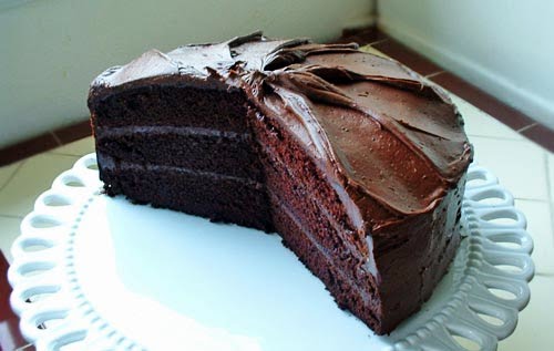 4 Pour into three 10" cake pans, bake at 350F for 25-35 minutes (adjust for convection); test by placing and removing a toothpick through the center at 25 minutes. When toothpick comes out clean, loosen from pans and then put back in the pans. Let cakes cool for 15 minutes. Keep in the pans, wrap in foil, and put in the freezer for at least 2 hours.