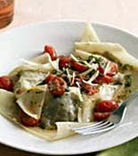 Bring a large pot of salted water to a boil, then add the remaining 2 tablespoons olive oil. Working with 1 at a time, fill each wrapper with 2 rounded tablespoons of the eggplant mixture; moisten the edges with water and fold in half, pressing the edges to seal. Working in 2 batches, cook the ravioli until tender, about 4 minutes. Using a slotted spoon, transfer 3 ravioli each to 4 shallow bowls. Stir 1/2 cup of the pasta cooking water into the tomato sauce and season with salt and pepper; spoon over the ravioli and sprinkle the remaining parmesan on top.