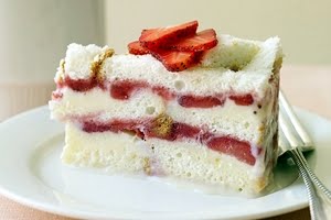 Line the bottom of a 9-inch round springform pan with one third of the cake slices, cutting any slices to fit the shape of the pan. Top with half the frozen yogurt, spreading it to the sides. Spread 2/3 cup strawberry sauce over the frozen yogurt, then top with half the remaining cake slices, again cutting any to fit. Spread the remainder of the frozen yogurt over the cake, top with 2/3 cup strawberry sauce, and finally seal the top with the remaining cake slices. Cover with plastic wrap and freeze at least 6 hours or up to 3 days. Let the cake stand at room temperature 10 minutes before unmolding. Slice into 12 pieces and serve. Yields 1 piece per serving.