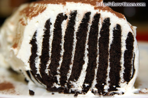Make whipping cream. Spread each chocolate wafer with a teaspoon of whipped topping, using about 2 cups for all wafers. Stack in groups of six. You’ll get 8 groups of six. Place stacks end to end on plastic wrap, pressing together lightly. I made 2 rolls of 4 stacks each instead of one long roll. Wrap and refrigerate at least 4 hours. Frost top and sides with remaining whipped topping just before serving. If desired, garnish with chocolate curls, grated chocolate or candied cherries. I just dust it with cocoa powder as I dont have any of the above mentioned. Cut into diagonal slices to serve. This recipe makes 10 servings.