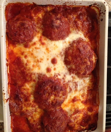 Spoon some sauce on the bottom of a casserole dish. Layer the eggplant on top. When I did it, it covered the bottom of the 9x13 with four extra slices on top. Top with the remaining sauce, and both the cheeses.