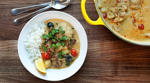 4. In the same Dutch oven set over medium heat, add the remaining 1½ tablespoons of oil, the onion and ginger and cook, stirring occasionally, until the onion is soft but not browned, about 6 minutes. Add the curry powder and the cayenne and cook, stirring constantly, until the spices are fragrant, about 30 seconds. Pour in the coconut milk and stir to combine. Add the potatoes and the reserved chicken thighs and bring the liquid to a simmer. Reduce the heat to low and cover the pot. Continue to cook until the chicken thighs and potatoes are cooked through and the sauce is thick, about 50 minutes.