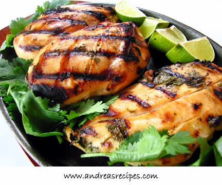 3. Preheat the grill to medium heat, and brush the grill rack with oil. Grill the chicken 10 minutes on the first side, then turn and cook another 8 minutes.