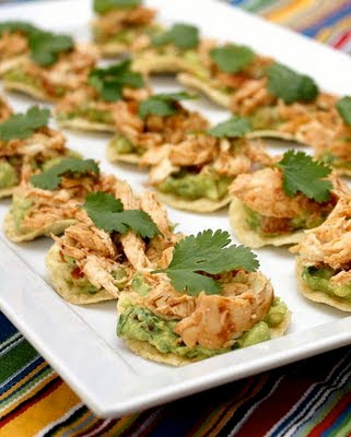 4. Just before serving, top each chip with a generous TBSP each of guacamole and chicken. Top with a cilantro leaf and arrange on a platter.