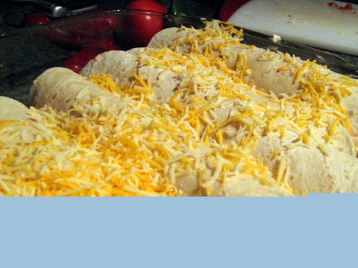 Pour sauce over enchiladas. Bake at 350 degrees for 30 minutes. Cover with cheese. Bake until cheese melts.