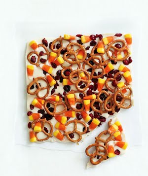 Line an 8-inch square baking pan with parchment, leaving an overhang. Spread 8 ounces melted white chocolate in the prepared pan and sprinkle with 1 cup miniature pretzels, ½ cup candy corn, and ⅓ cup dried cranberries.