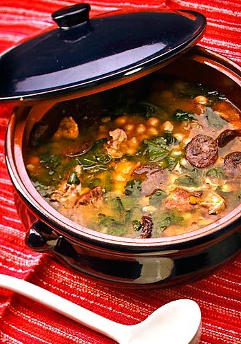 4. Remove the stew from heat and set it aside for about 10 minutes to marry the flavors. Remove the meats from the stew. Cut the meats into pieces (remove the bones), then stir the pieces back in with the stew. Remove the sachet, taste and season the stew if desired. Serve the chickpeas, meats, vegetables and broth in shallow soup dishes.