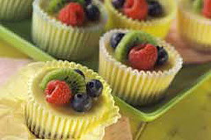 Omit the whipping cream, blueberries and lemon zest. Bake and refrigerate cheesecakes as directed. Spread evenly with 1/3 cup strawberry jam. Garnish with fresh strawberry halves and mint sprigs. Or, spread each cheesecake with 2 Tbsp. PHILADELPHIA SNACK DELIGHTS Milk Chocolate, then top with 1 tsp. BAKER'S ANGEL FLAKE Coconut.