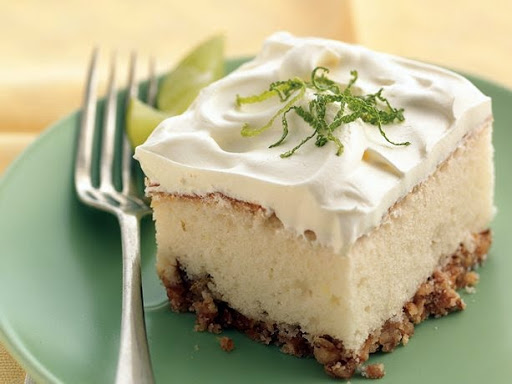 took this recipe and changed it a bit...used 1/3 cup frozen limeade thawed with 1 cup water preparing the cake also added zest from 2 small limes and a splash of green food coloring to the white cake...after baked and cooled, removed it from the sheet pan and cut horizontally and filled with a key lime custard from a pie mix....placed the pretzel mixture in the bottom and replaced the cake...drenched the top of the cake with some of the limeade with a bit of tequila (1/4 cup)....then iced with canned white icing thinned with a little limeade and zest...was so good and moist served cold